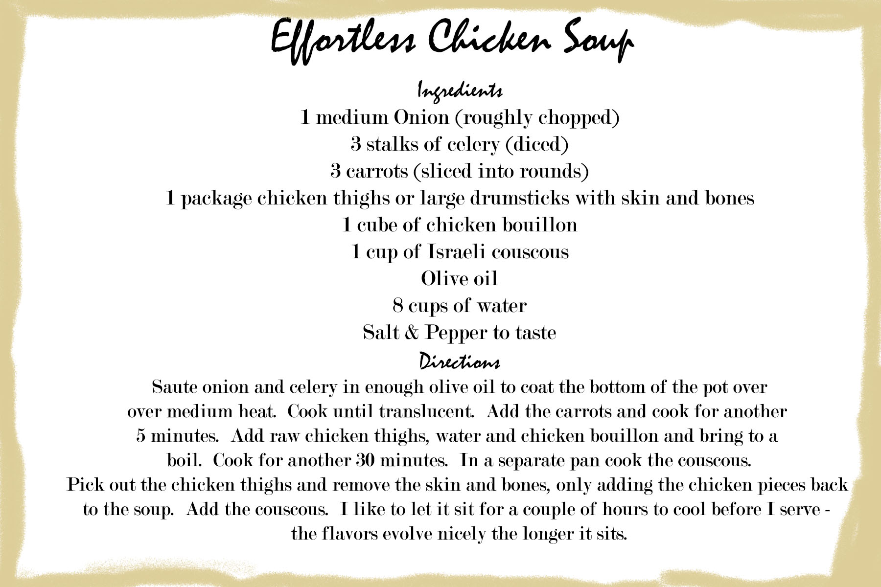 Chicken soup is what I looked forward to most from my Mom when I didn’t feel up to par and was forced to stay home from school. “Forced” being the operative word. 🙂