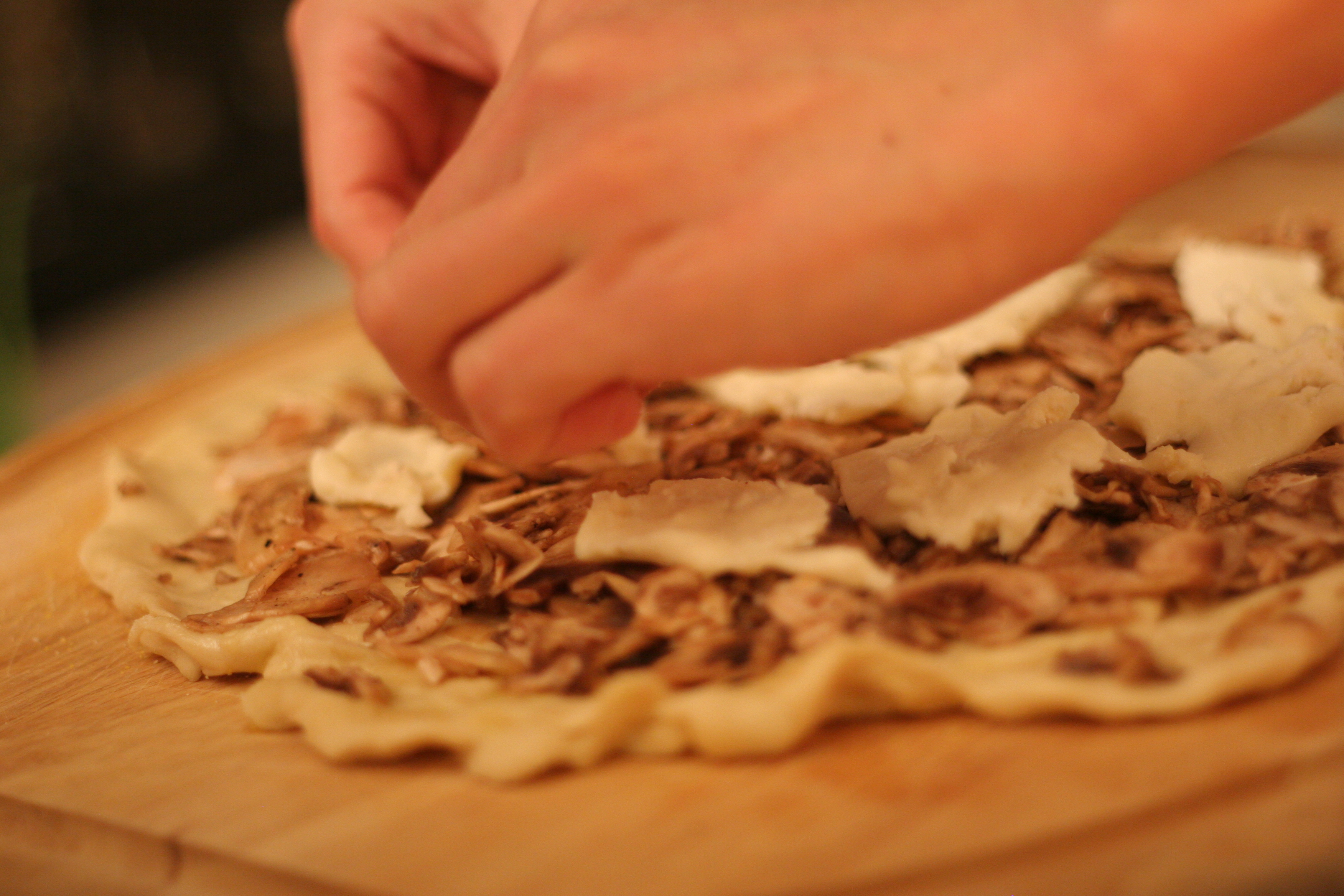 My affection for taleggio cheese began in a small wine bar in Hell’s Kitchen that I adore called Casellula. I lived in the neighborhood for a short year and this wine and cheese bar was one of my favorite go-to spots in area. They have a plentiful selection of refined cheeses, meats and small plates – just my kind of place. I was first introduced to taleggio there and was smitten from the start. Taleggio is miraculous on pizza and while the texture is sticky and soft (making it difficult to cut) when cold, it melts perfectly. The cheese tastes a bit like mushrooms itself so makes the perfect complement to any mushroom za. It is mild, earthy, nutty and slightly fruity. Yum…
