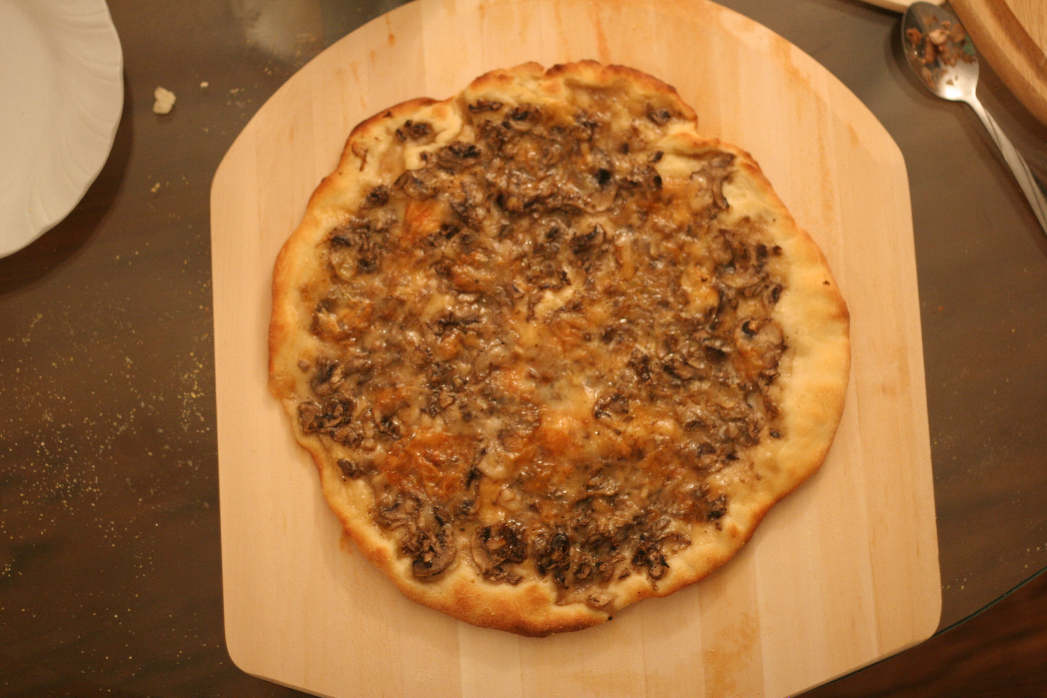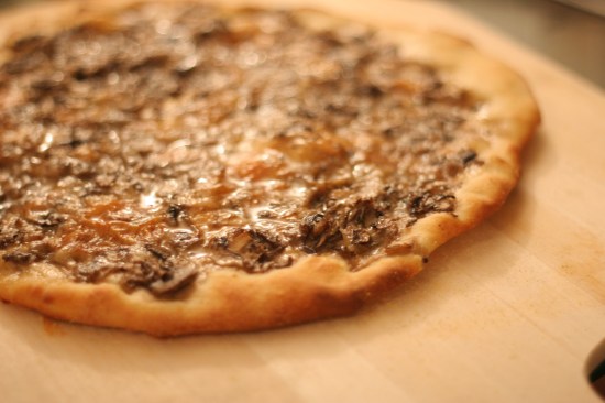 After the second rising period your dough should be ready for action. First, sprinkle corn meal onto your peel (or baking sheet) so that the dough does not stick. Pinch the sides of the dough ball into a crust and pull the dough (it should be nice and elastic-y) until it forms a nice rounded pie. Place onto your peel and add the toppings. I like to first brush the dough with a bit of olive oil first and lightly sprinkle some parmesean cheese. I then coat the pizza with mushrooms and add taleggio on top. At this point your oven should be piping hot so don’t forget to put your oven mitts on! Slide the pizza onto the stone (it should slide off easily) or place your pizza on the baking sheet and into the oven. Let it cook for only 10 minutes for crispy crust or 6-8 minutes for softer crust (I like mine crispy). The last step is easy, just sprinkle truffle oil onto the pizza and a bit more of the parm…and marvel at your accomplishemnt…homemade restaurant style pizza that has a bit of artisan flair to it right in your very own home!